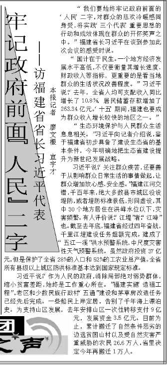 “我們要始終牢記政府前面的‘人民’二字,對群眾的悲歡冷暖感同身受。”2002年3月4日,人民日報(bào)兩會特刊的“代表團(tuán)之聲”欄目里,刊發(fā)了對時任福建省省長的習(xí)近平代表的采訪,標(biāo)題是《牢記政府面前“人民”二字》。