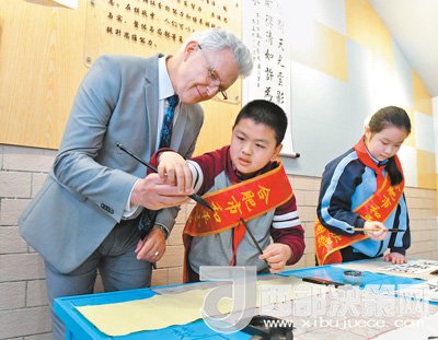 日前,加拿大溫哥華公立教育局考察團(tuán)走進(jìn)安徽省合肥市和平小學(xué)參加中外文化交流活動,親身體驗書法、民樂和戲曲等傳統(tǒng)文化課程,零距離感受中國文化的魅力。圖為加拿大客人和和平小學(xué)的學(xué)生們一起學(xué)習(xí)書法。
