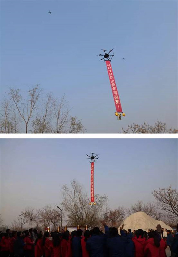 啟動儀式上,華山景區(qū)還為活動前期征集的十名幸運游客送上新年大禮包,讓跨年登山的游客享受到華山的新年祝福。同時,為了配合活動效果,讓華山新年更具新意,現場出動三架無人機進行空中表演,更是以語音播報及橫幅展示的方式為現場游客送上新年寄語。