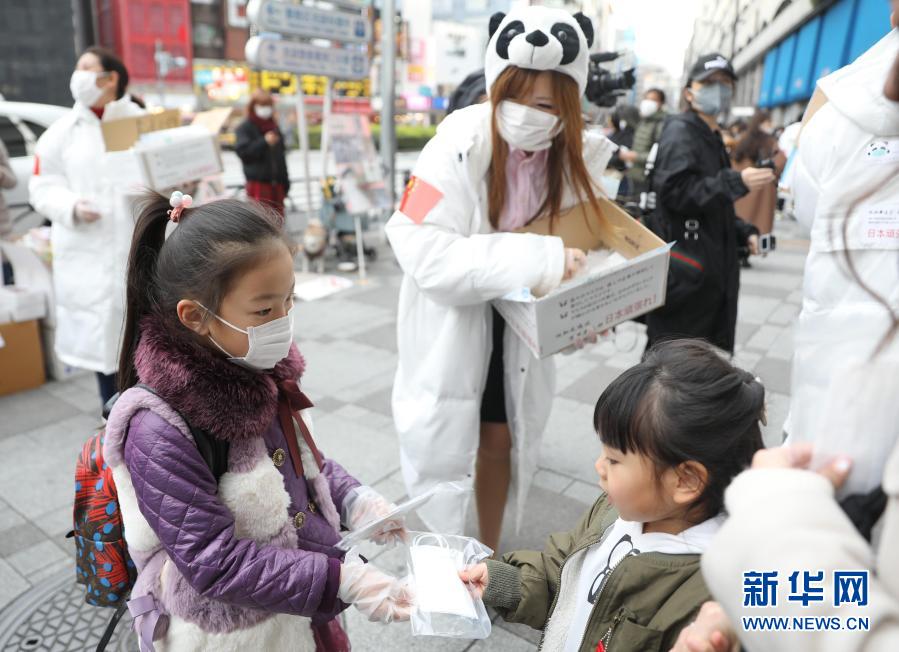 2月29日,在日本東京的池袋站前,在日華僑華人志愿者團(tuán)體“口罩熊貓行動小組”向當(dāng)?shù)孛癖娒赓M發(fā)放口罩,一名小志愿者(左)將兒童用口罩送給日本小朋友。新華社記者 杜瀟逸 攝