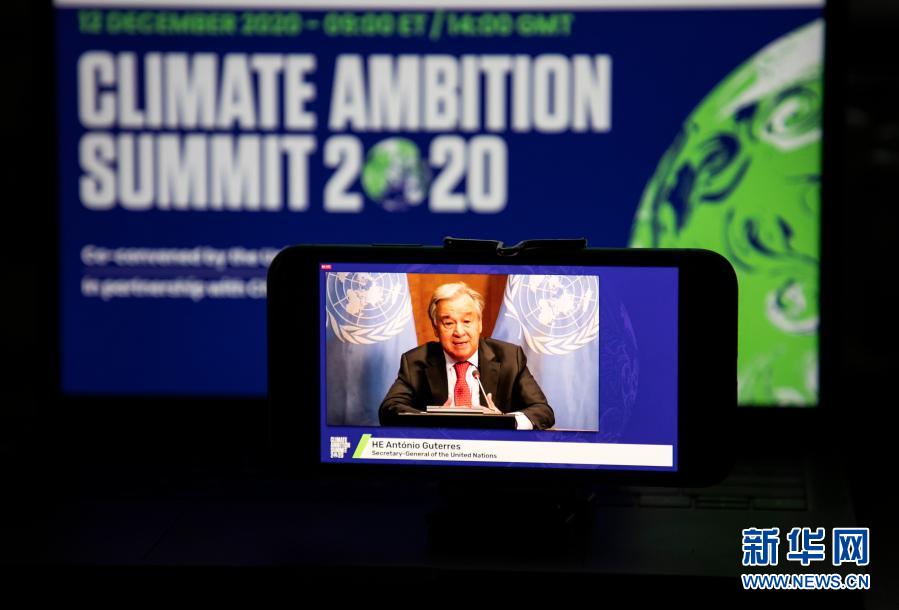 這是2020年12月12日在美國紐約拍攝的聯(lián)合國秘書長(zhǎng)古特雷斯在氣候雄心峰會(huì)上通過視頻發(fā)表講話的屏幕畫面。氣候雄心峰會(huì)由聯(lián)合國及有關(guān)國家倡議舉辦,旨在紀(jì)念《巴黎協(xié)定》達(dá)成五周年,進(jìn)一步動(dòng)員國際社會(huì)強(qiáng)化氣候行動(dòng),推進(jìn)多邊進(jìn)程。新華社記者 王迎 攝