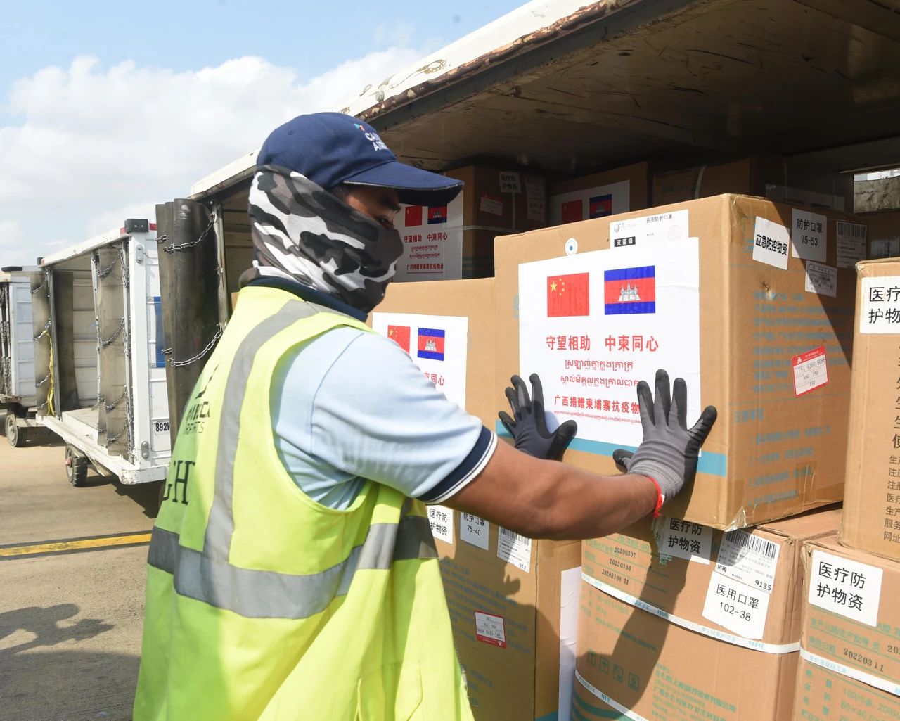 △2020年3月23日,一架搭載7名來(lái)自廣西壯族自治區(qū)醫(yī)療專(zhuān)家和一批防疫醫(yī)療物資的中國(guó)南航包機(jī)降落在柬埔寨首都金邊國(guó)際機(jī)場(chǎng)。