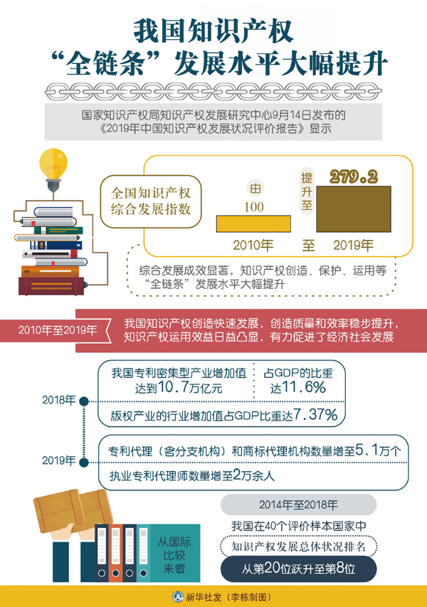 科技創(chuàng)新的時代大潮奔騰不息。除了高鐵這張響亮的名片,我國在信息通信、航空航天、核能等領(lǐng)域也已形成一批擁有自主知識產(chǎn)權(quán)的核心技術(shù),一次又一次刷新著我國高科技領(lǐng)域知識產(chǎn)權(quán)的紀錄。2020年底,世界知識產(chǎn)權(quán)組織發(fā)布的《2020年全球創(chuàng)新指數(shù)》報告顯示,在全球131個經(jīng)濟體中,中國的創(chuàng)新能力持續(xù)位居世界前15行列,是躋身綜合排名前30位的唯一中等收入經(jīng)濟體。我國商標申請量、發(fā)明專利申請量連續(xù)多年位居世界首位;我國著作權(quán)產(chǎn)業(yè)在國民經(jīng)濟中的比重連年提升,2019年達到7.39%。
