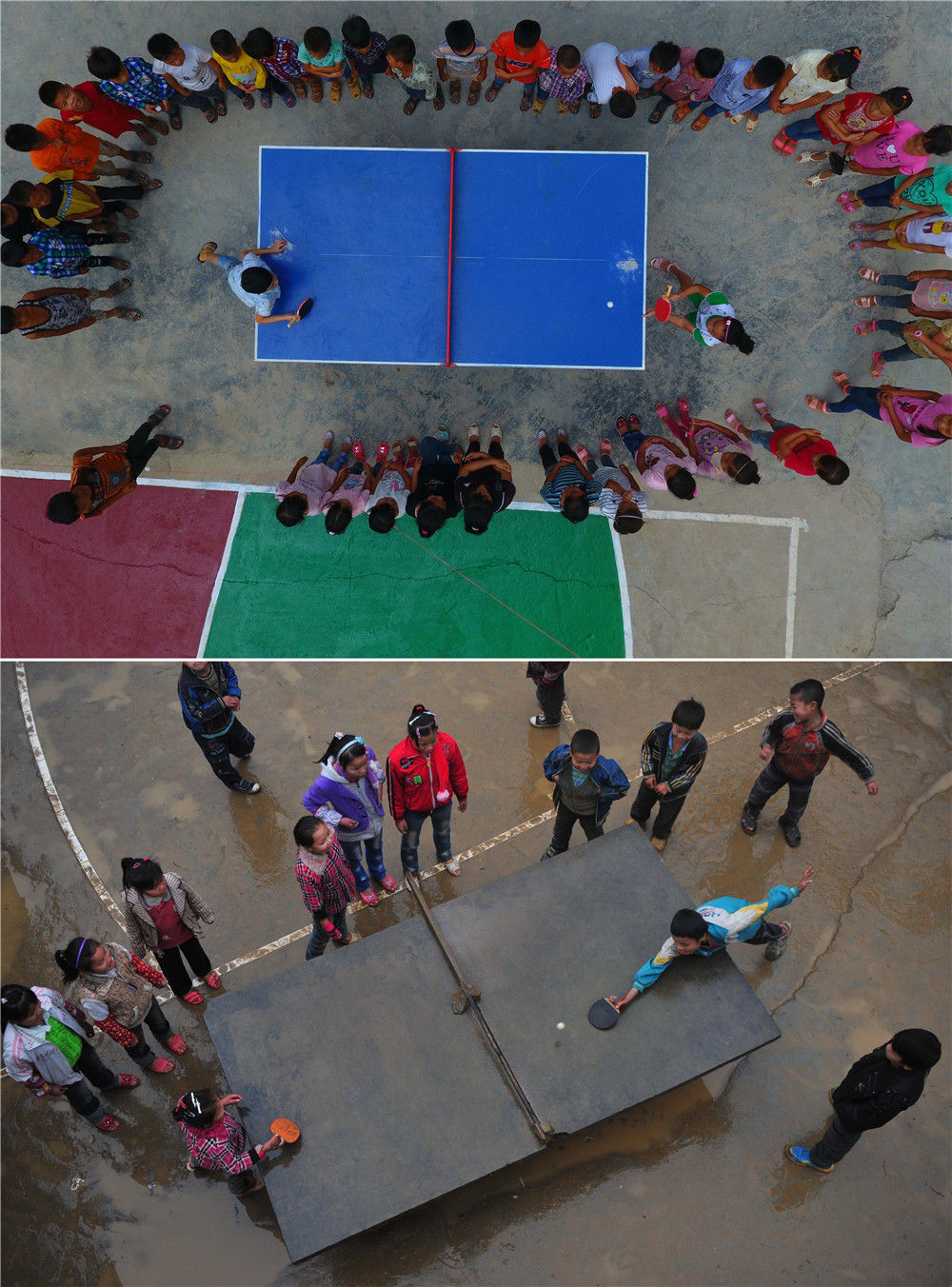 拼版照片:上圖為在廣西大化瑤族自治縣板升鄉(xiāng)弄勇小學(xué),孩子們?cè)诖蚱古仪颍?017年9月4日攝,無人機(jī)照片);下圖為在弄勇小學(xué),孩子們?cè)诖蚱古仪颍?012年12月26日攝)。新華社記者 黃孝邦 攝