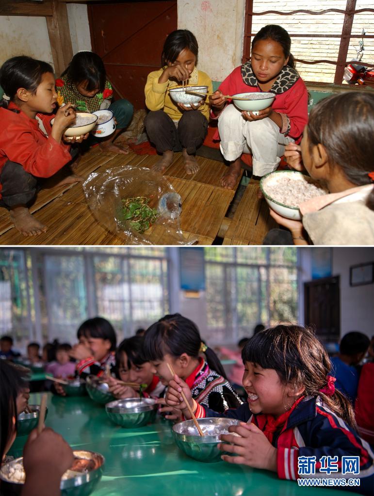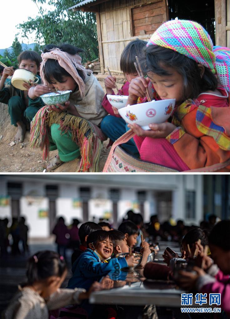 這張拼版照片的上圖:2003年12月6日,云南省瀾滄拉祜族自治縣富邦鄉(xiāng)半山村小學(xué)的孩子們在吃飯(新華社記者 李銀 攝);下圖:2021年3月2日,云南省瀾滄拉祜族自治縣富邦鄉(xiāng)半山村小學(xué)已撤并到富邦鄉(xiāng)中心完小,這是孩子們在吃飯(新華社記者 江文耀 攝)。新華社發(fā)