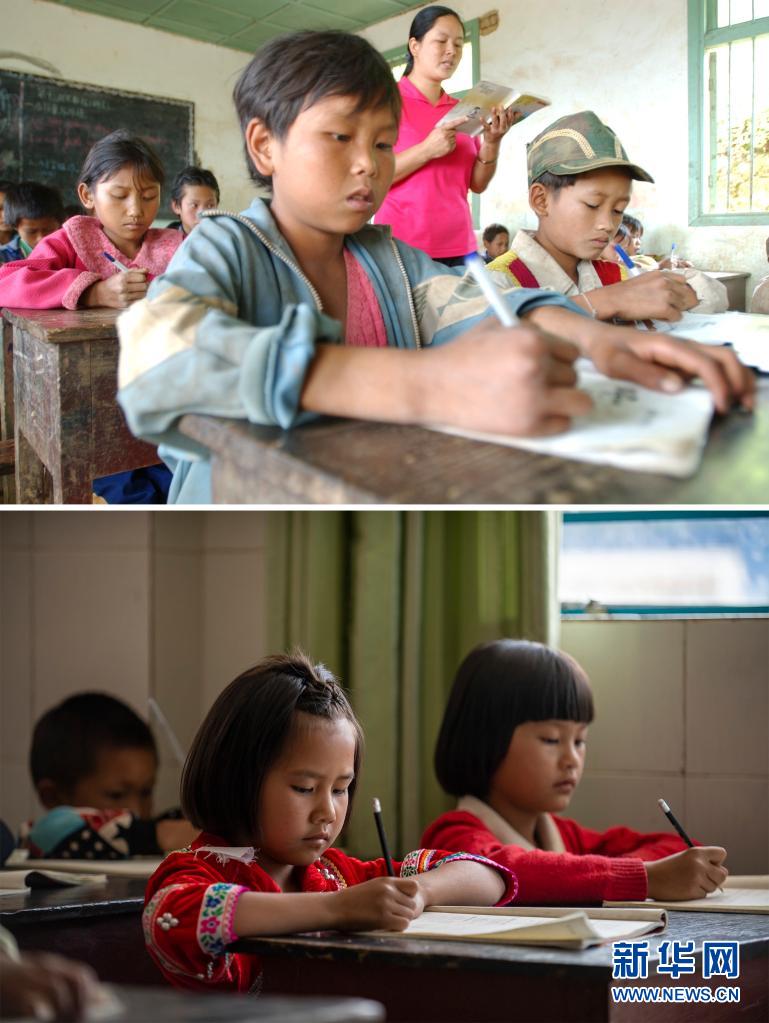 這張拼版照片的上圖:2003年12月6日,云南省瀾滄拉祜族自治縣富邦鄉(xiāng)半山小學(xué)的孩子們在上課(新華社記者 李銀 攝);下圖:2021年3月2日,云南省瀾滄拉祜族自治縣富邦鄉(xiāng)半山小學(xué)已撤并到富邦鄉(xiāng)中心完小,這是孩子們在教室里上課(新華社記者 江文耀 攝)。新華社發(fā)