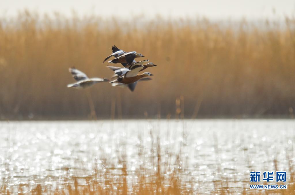 這是在位于內(nèi)蒙古阿拉善盟額濟納旗的居延海濕地拍攝的候鳥(2021年4月13日攝)。新華社記者 連振 攝