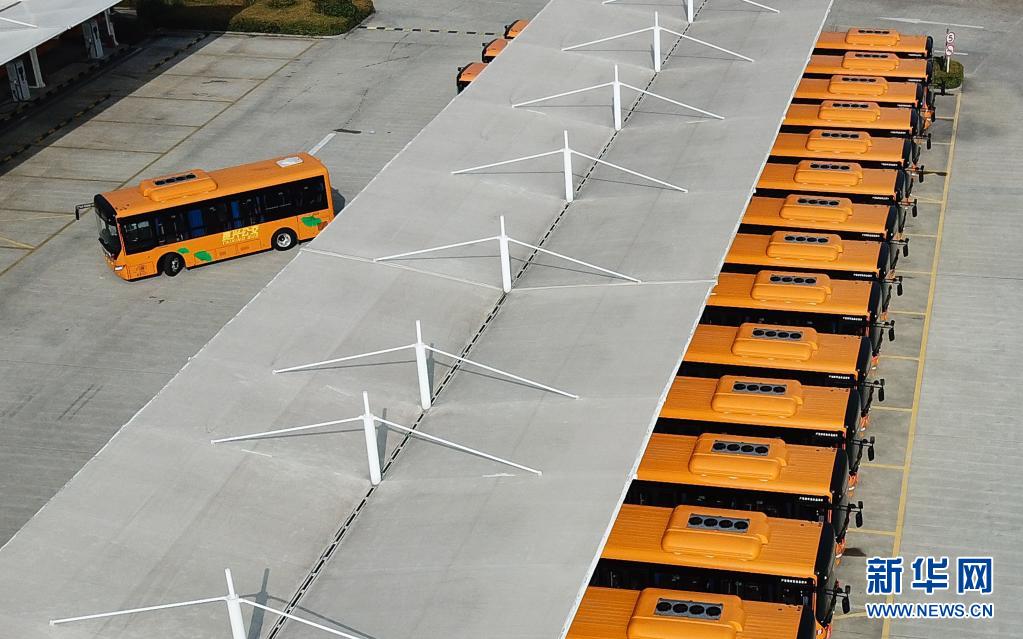 在江蘇省泰興市公交總站,一輛純電動公交車入站充電(2018年11月10日攝,無人機照片)。新華社記者 季春鵬 攝