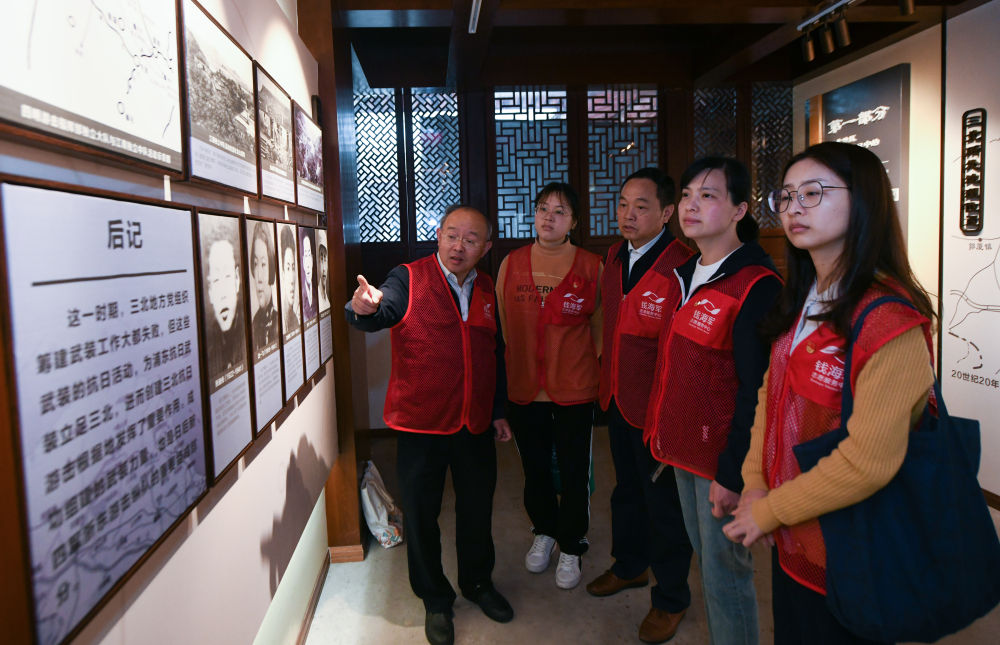 ↑2021年4月23日,浙江慈溪市錢海軍志愿服務(wù)中心黨支部的黨員在浙東抗日根據(jù)地舊址參觀學(xué)習(xí)。