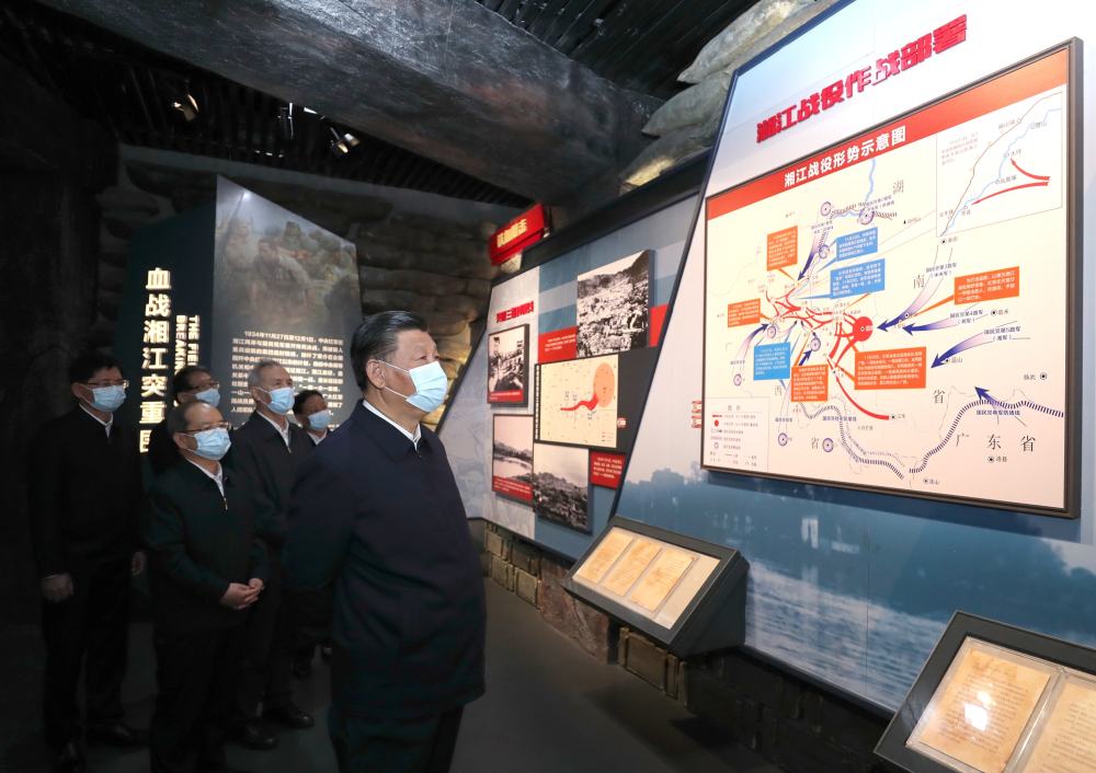 ↑2020年9月16日,習(xí)近平在湖南郴州市汝城縣文明瑤族鄉(xiāng)沙洲瑤族村“半條被子的溫暖”專題陳列館,了解當(dāng)?shù)丶訌?qiáng)基層黨的建設(shè)、開(kāi)展紅色旅游和紅色教育情況。