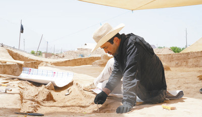 5月,比龍?jiān)谖挥跒跗潉e克斯坦南部城市拜松的拉巴特遺址進(jìn)行考古挖掘。孫和筱攝