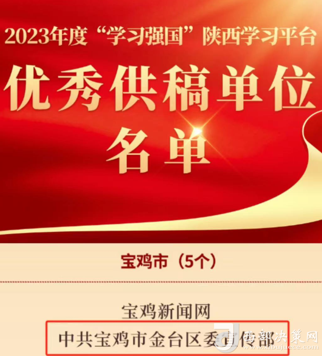 西部決策網(wǎng)訊(記者帥華鋒 通訊員 徐紅娟)近日,在“學(xué)習(xí)強(qiáng)國”陜西學(xué)習(xí)平臺2023年度管理員通訊員培訓(xùn)會上,中共寶雞市金臺區(qū)委宣傳部被授予“優(yōu)秀供稿單位”榮譽(yù)稱號,成為寶雞僅有的5個(gè)受表彰供稿單位之一。