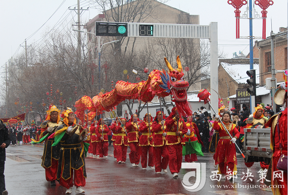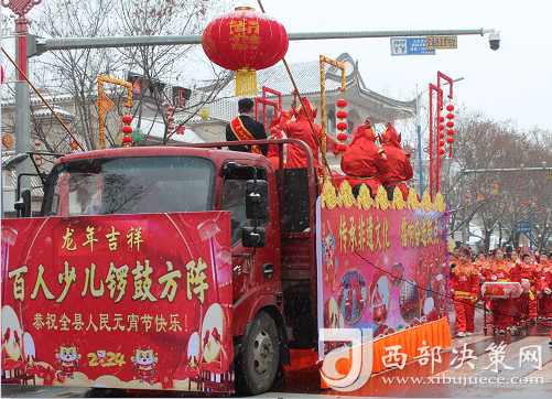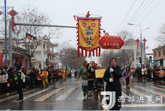 集中展演之后,全省各地社火與隴縣裝扮的百面旗林、百面鼓隊、百人馬社火、百人少兒鑼鼓、百人少兒社火、百人地臺社火和特色社火、車社火、高芯社火方陣沿縣城迎賓大道--東大街--西門口--新建路--千邑大橋進行巡游,讓大家感受了社火的獨特魅力,為大家送去新春的祝福。